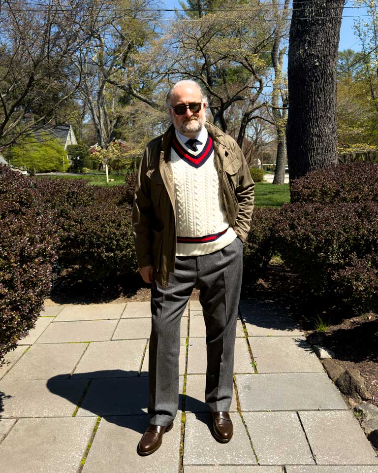 Links may be affiliate that earn commision. Sweater: Ralph Lauren Jacket: Spier & Mackay Shirt: Proper Cloth (10% off your first purchase with TB10!) Tie: H. N. White (Same brand, similar tie) Trousers: Spier & Mackay Shoes: TLB Mallorca Sunglasses: Persol
