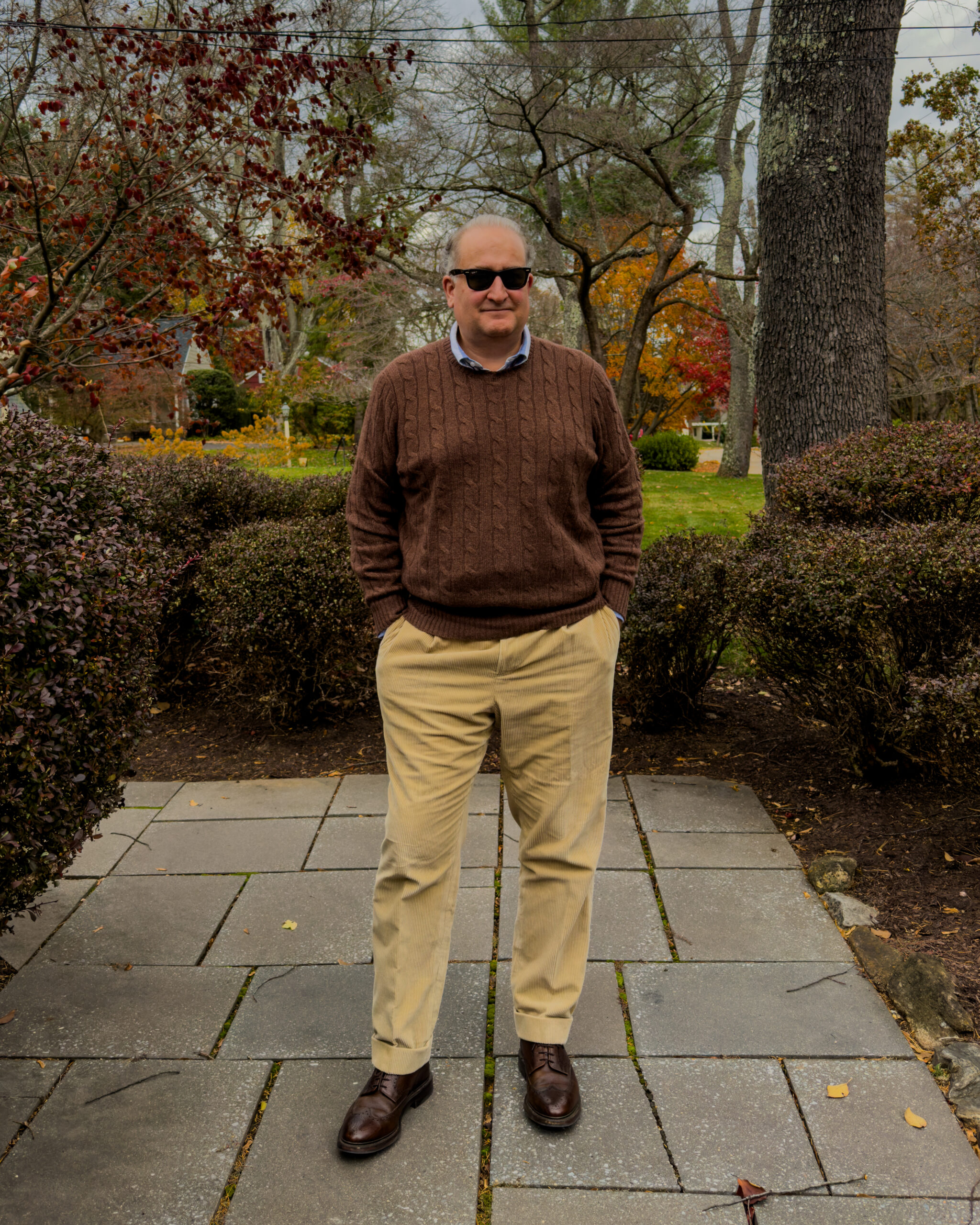 Links may be affiliate that earn commission. Sweater: Ralph Lauren Shirt: Morris & King Trousers: Spier & Mackay (Similar) Shoes: Crockett & Jones Sunglasses: Ray-Ban