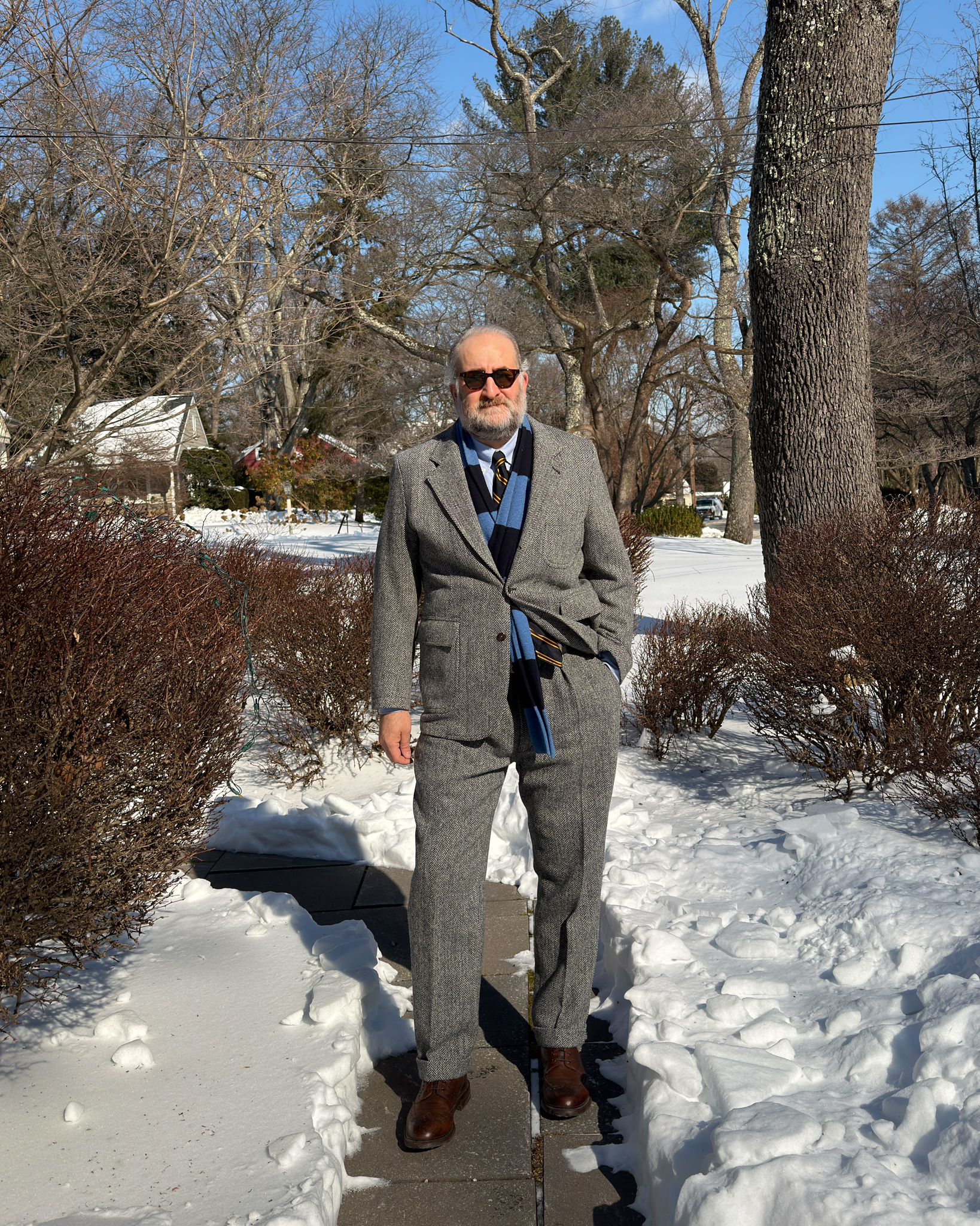 Links may be affiliate that earn commission. Jacket: Drake’s Trousers: Drake’s Shirt: Morris & King Tie: Shibumi-Firenze Scarf: J. Crew Shoes: Crockett & Jones Sunglasses: Caddis